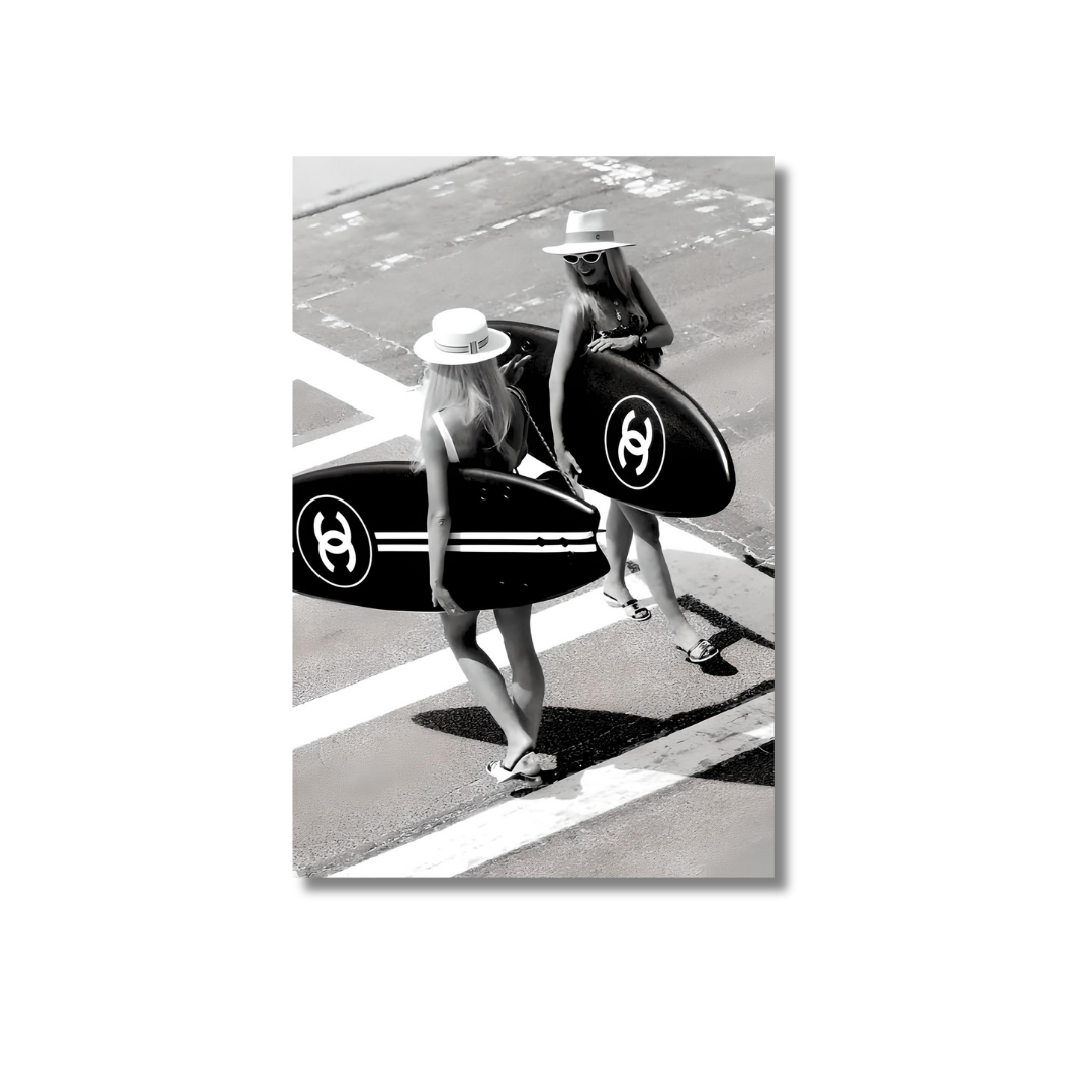 The "Surfside Glamour" poster captures a chic moment of elegance at the beach. Featuring two stylish women carrying sleek, monochromatic surfboards with bold branding, this black-and-white composition embodies effortless luxury and sophistication. The contrast of high fashion against the carefree, sunny backdrop creates a striking visual that merges sport with style. Perfect for lovers of surf culture and high-end aesthetics, this poster is a statement piece that exudes bold confidence and coastal charm.